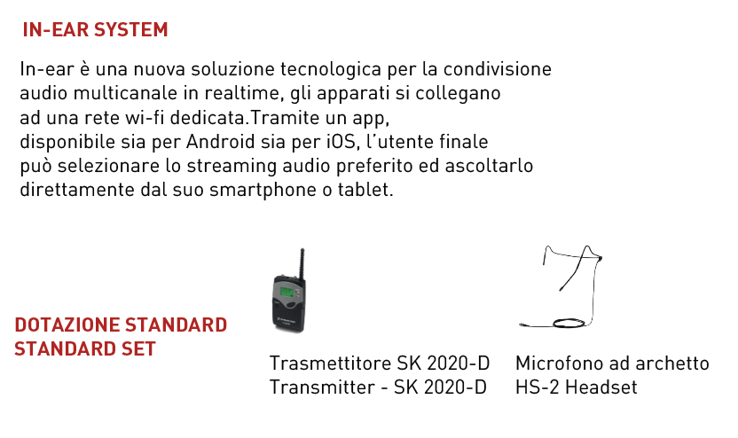 In-ear is a new technological solution for sharing multichannel audio in real time. The devices connect to a dedicated Wi-Fi network. Through an app, available for both Android and iOS, the user can select their preferred audio stream and listen to it directly from their smartphone or tablet.